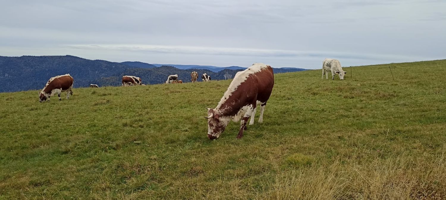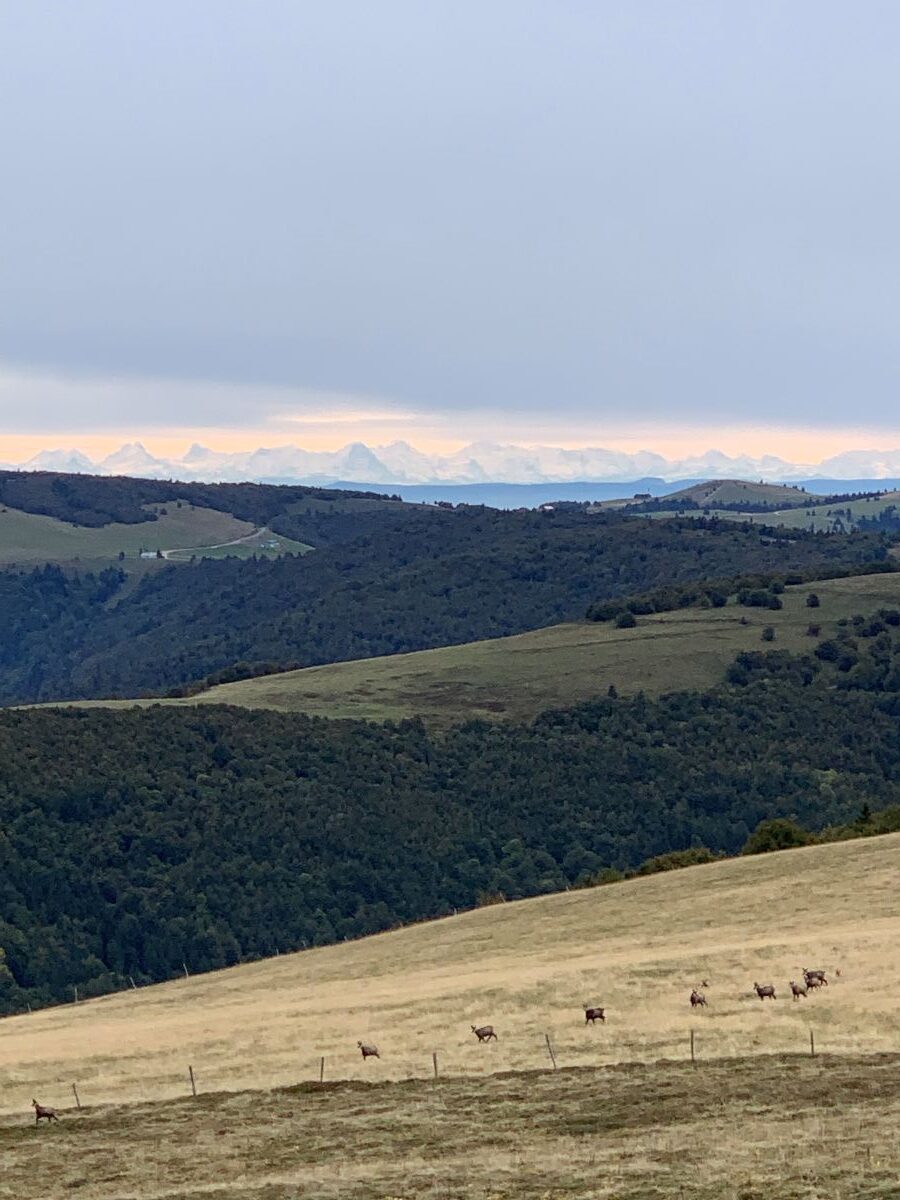 Das Wetter war zwar kühl und windig, blieb aber den ganzen Tag über trocken. Dank des Föhns öffneten sich immer wieder weite Fernblicke bis zu den Alpen, die uns alle sehr beeindruckten. Unterwegs konnten wir eine Herde Gämsen beobachten, und auf den Bergweiden begleiteten uns zahlreiche Münstertäler Rinder mit ihrer typischen Zeichnung.