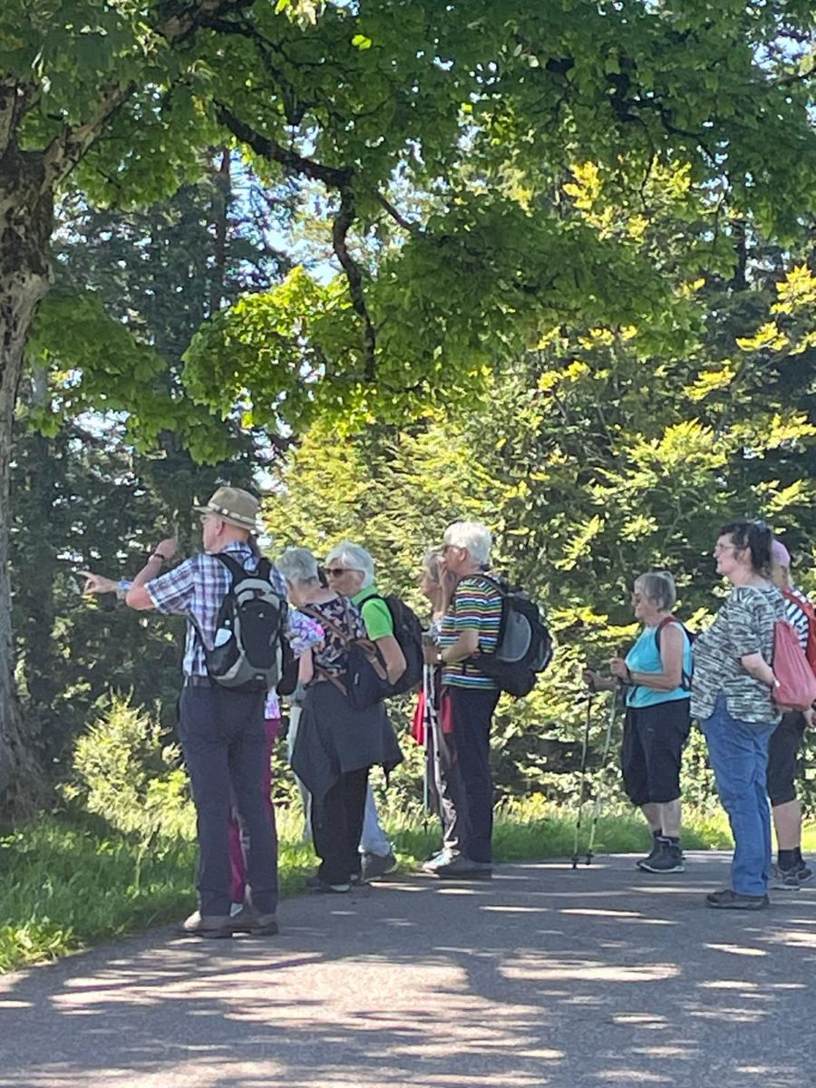 13 gutgelaunte Wanderinnen und Wanderer haben am 7. August bei herrlichem Sonnenschein den Pfisterwald und Teile des Weißtannenlehrpfads in St. Märgen erkundet. Wunderschöne Weitblicke gab es dabei auf der Thomashöhe rundum auf unsere Schwarzwaldberge.